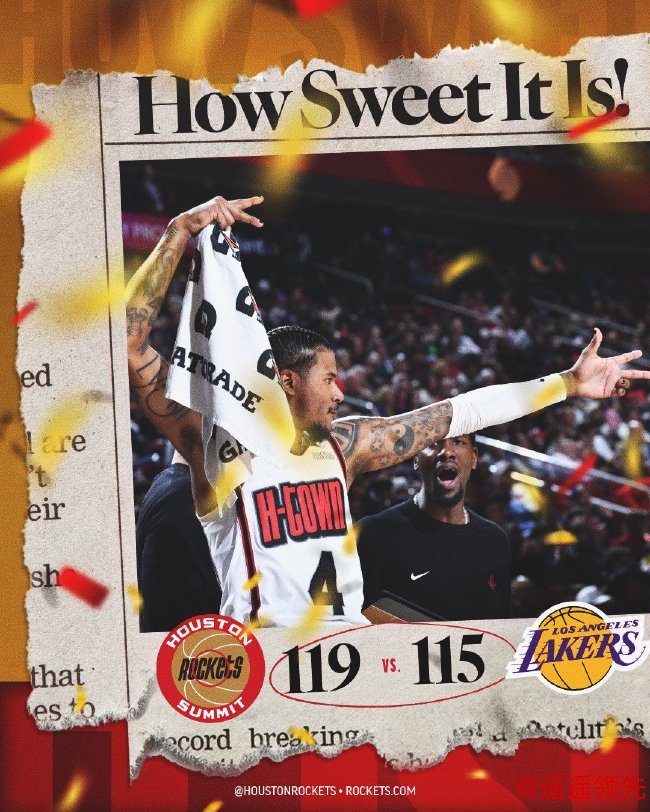 北京时间1月6日,NBA常规赛,火箭119-115险胜湖人,火箭赢球稳居西部第二,湖人跌至西部第五。