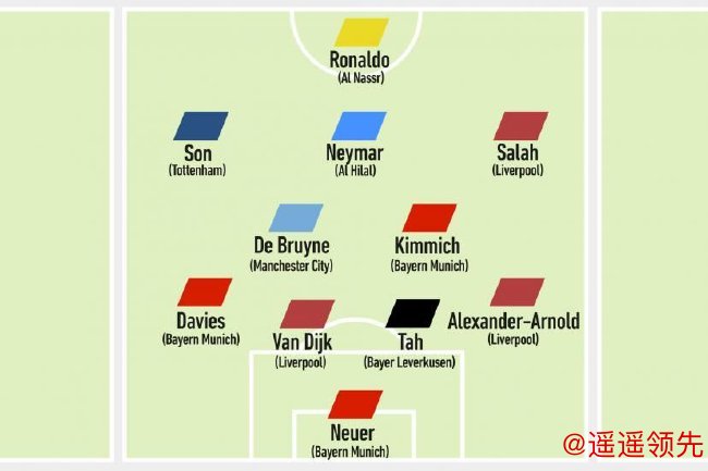 在这份阵容中,皇冠现金网会员前锋是C罗,中场分别是孙兴慜、内马尔、萨拉赫、德布劳内和基米希,后卫包括阿方索-戴维斯、范迪克、约纳坦-塔和阿诺德,门将是诺伊尔。
